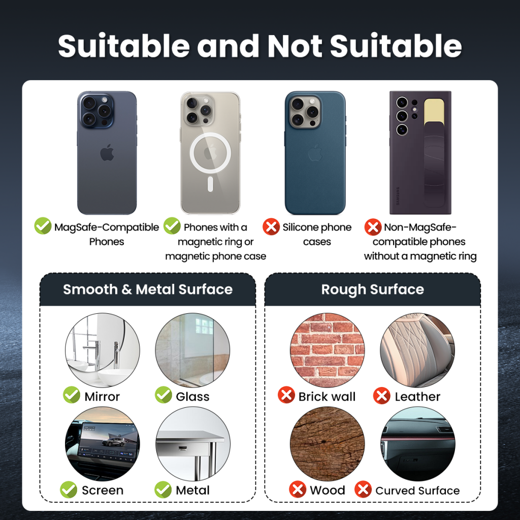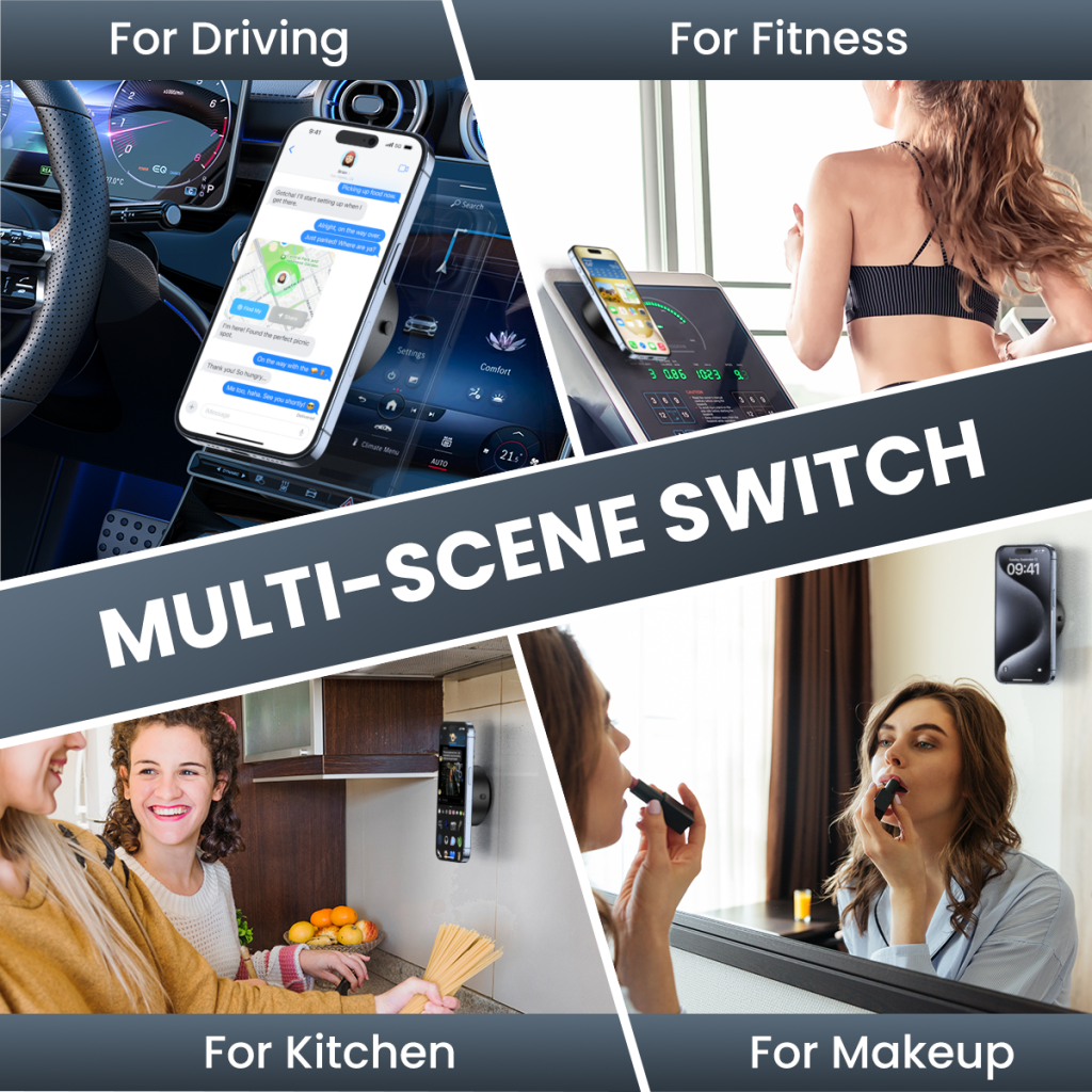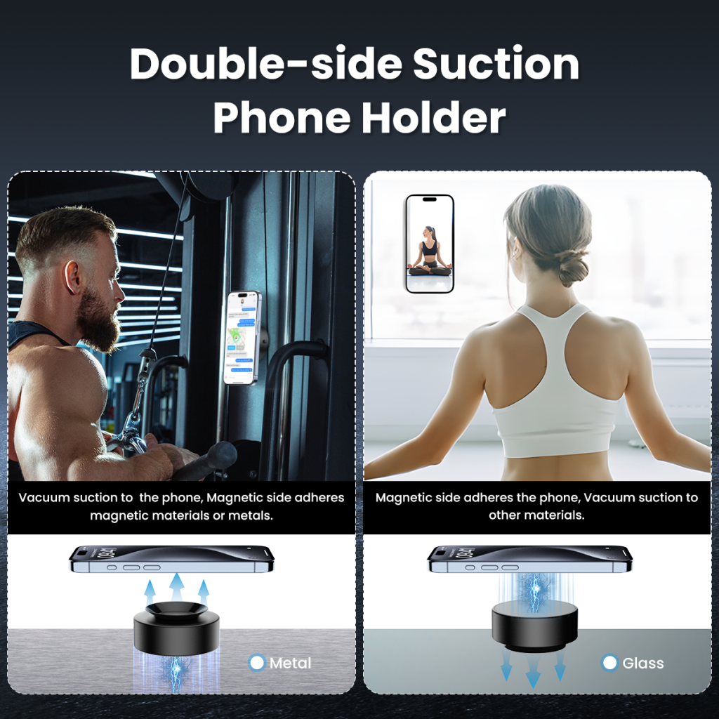 Thanks to the vacuum attachment system, supported by an integrated battery, the holder remains firmly attached, even on uneven surfaces. The construction