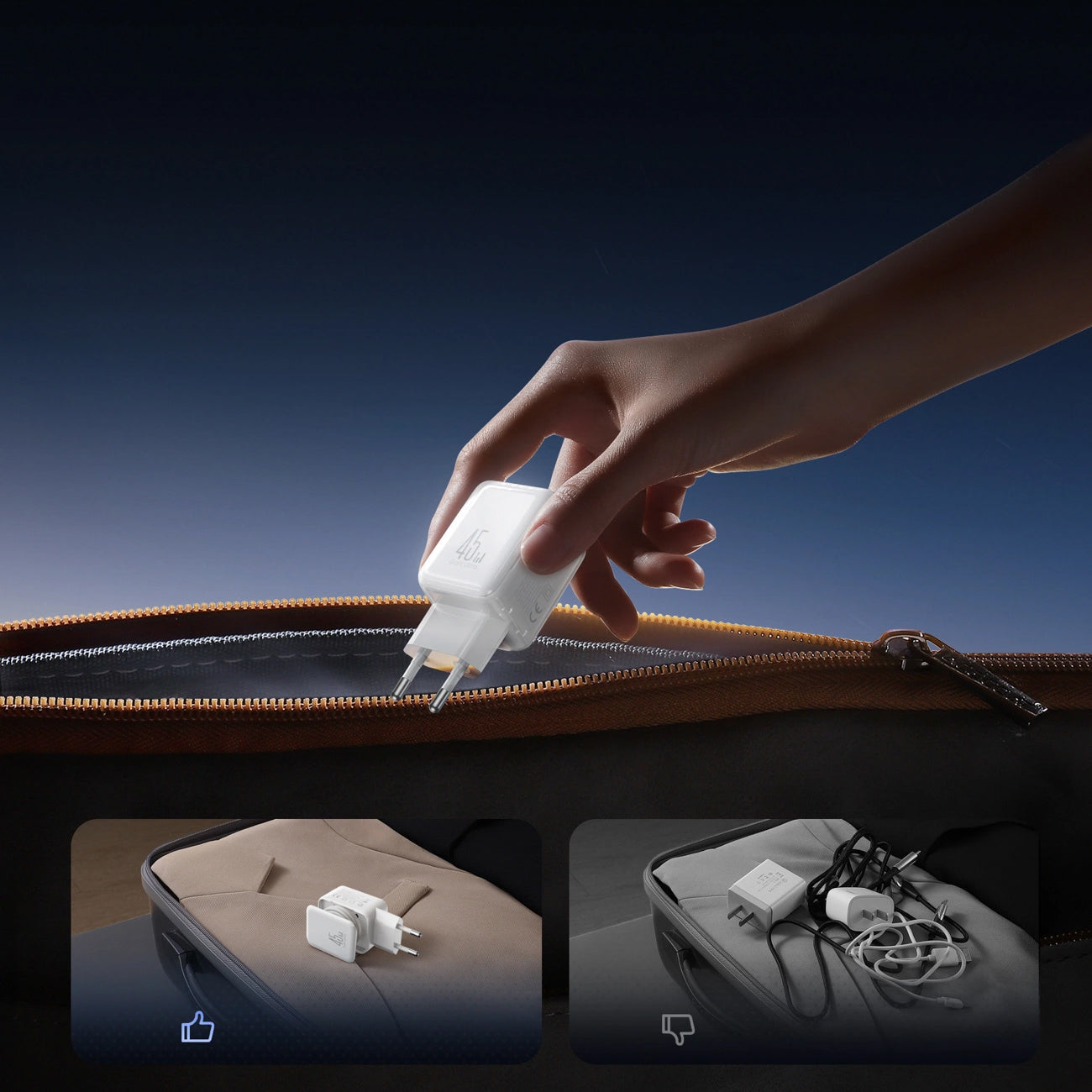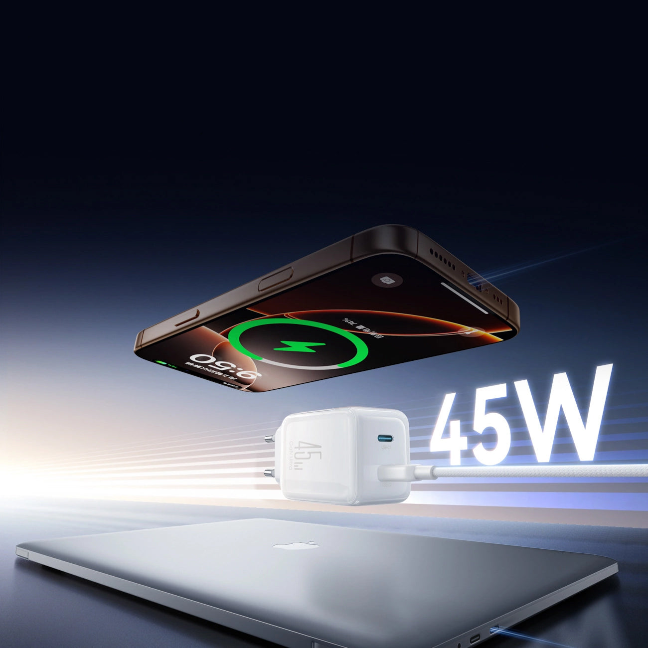 Képes egy laptopot 45W-ig és két telefont egyidejűleg 30W + 15W teljesítménnyel tölteni, automatikusan alkalmazkodva minden eszköz specifikációihoz a PPS és UFCS technológiák segítségével.