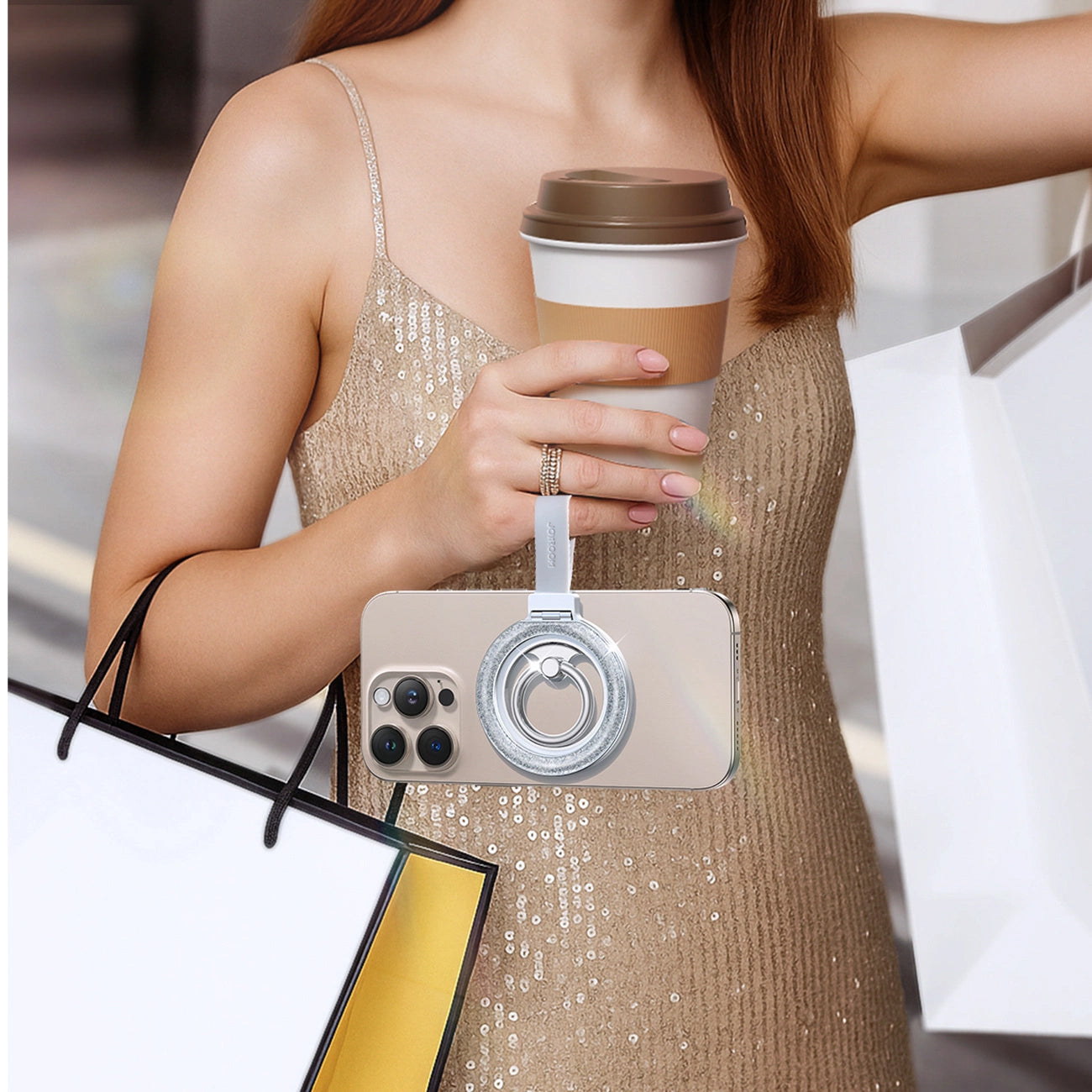sofisztikált megjelenést kölcsönöznek a telefonnak, miközben a gyűrű biztos és kényelmes fogást nyújt minden helyzetben. Az erős N56 mágneseknek köszönhetően a tartó azonnal rögzíthető a MagSafe-kompatibilis telefonokhoz és a mágneses tokokhoz, a mellékelt fémg
