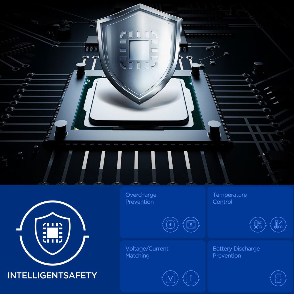 Az IntelligentSafety rendszer teljes védelmet biztosít a túltöltés megelőzésével, a hőmérséklet-szabályozással és az akkumulátor védelmével a biztonságos napi használathoz.