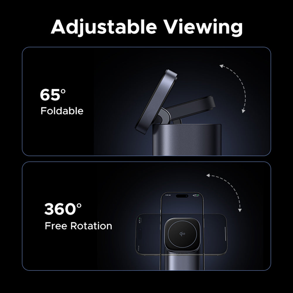 Az UGREEN X555 4in1 vezeték nélküli töltő a teljes megoldás az eszközeid hatékony és rendezett töltésére. Összesen 65W teljesítménnyel és több porttal, ez a töltő lehetővé teszi a telefonok, fülhallgatók, okosórák és egyéb készülékek egyidejű töltését. Az erős mágnes stabil és biztonságos kapcsolatot biztosít, megakadályozza a túlmelegedést és védi az eszközöket. Az intelligens tervezés lehetővé teszi, hogy telefontartóként is használható legyen, kényelmet nyújtva otthon és az irodában egyaránt.