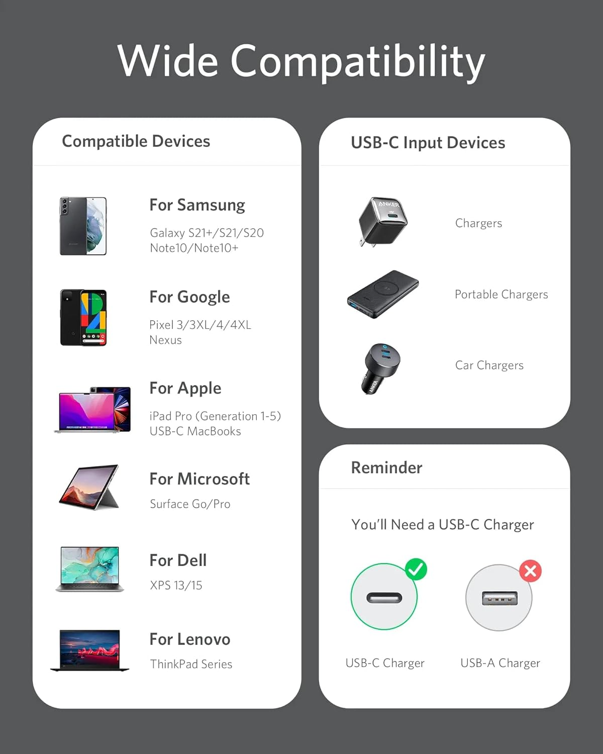 - Kompatibilitás: USB-C telefonok, táblagépek és laptopok