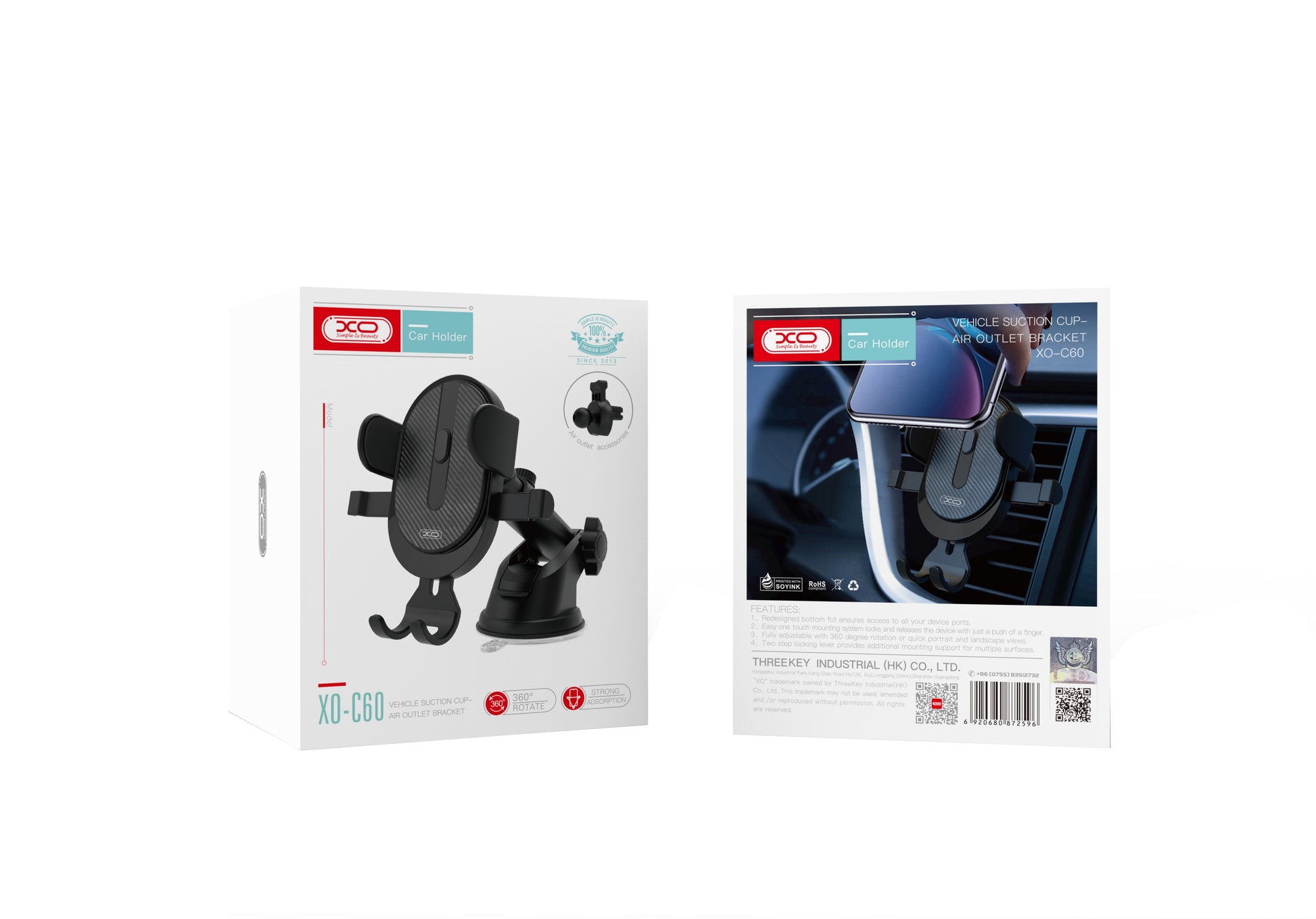 Az XO Design C60 egy sokoldalú 2in1 modell, amelyet a szellőzőrácsra, valamint a szélvédőre vagy a műszerfalra is felszerelhető a mellékelt tapadókorong segítségével.